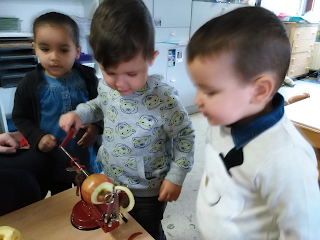 We maakten schilletjes van de appel met onze appelboor-machine, een beetje kaneel op en in de oven.
