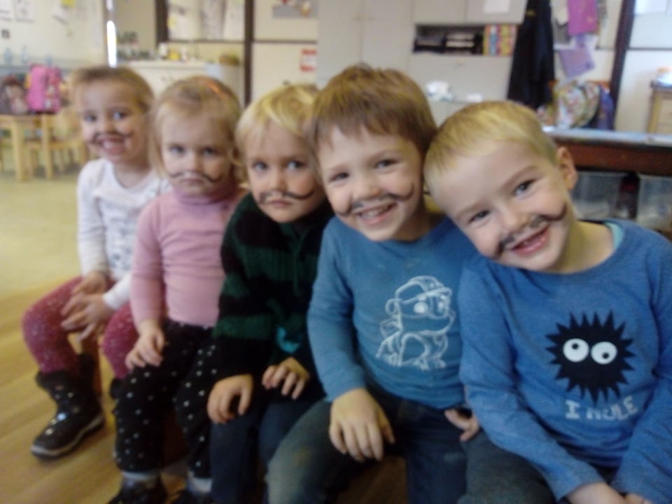 Vic, Marie en Marlies hadden de dag nadien snorretjes meegebracht. We maakten een tafeltje klaar waar we onszelf kunnen bewonderen met een snor.